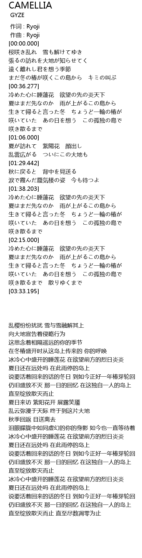 | [03:09.555] | 生きて帰ると言った冬 ちょうど一輪の椿が |