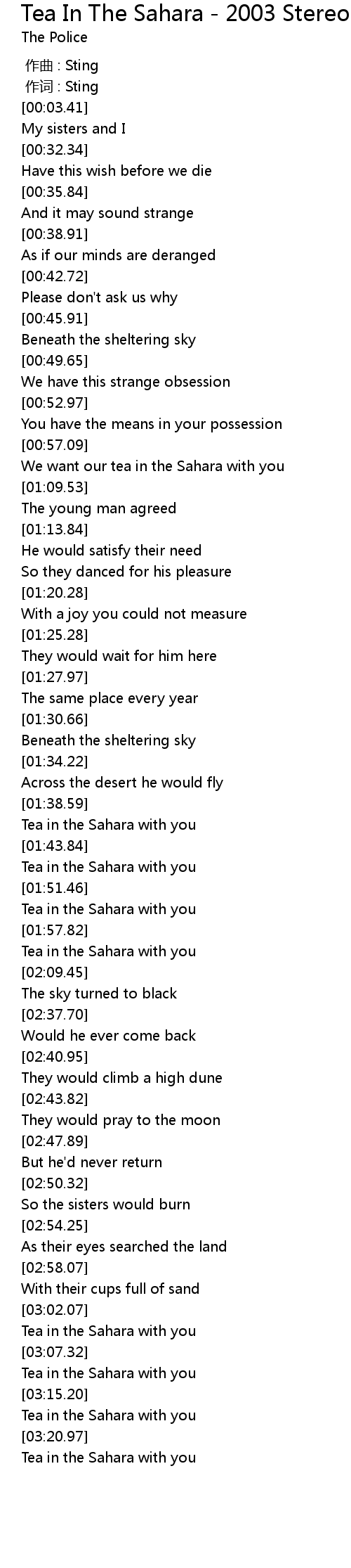 | Song | Tea In The Sahara - 2003 Stereo Remastered Version |