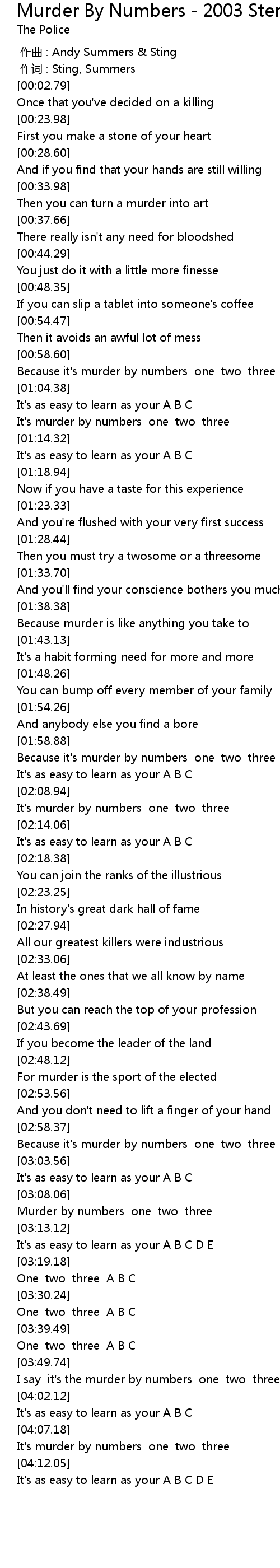 | [03:56.68] | I say it' s the murder by numbers one two three |