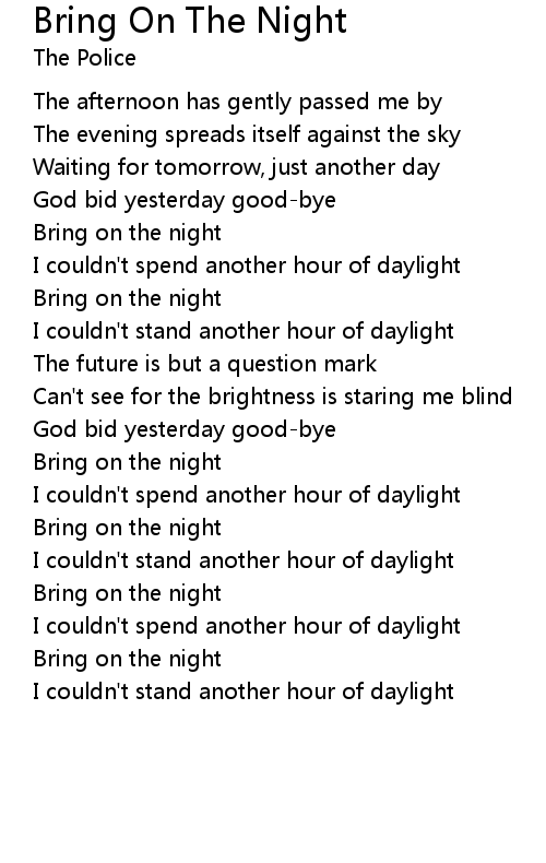| [01:16.800] | I couldn't stand another hour of daylight |