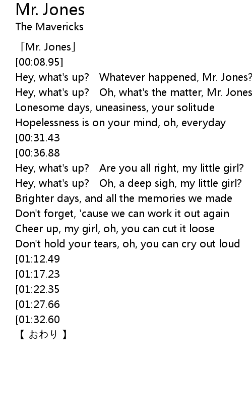 | [00:10.95] | Hey, what's up? Whatever happened, Mr. Jones? |