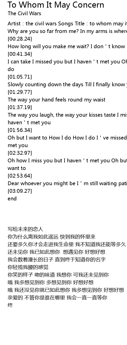 | [00:00.35] | Artist: the civil wars Songs Title: to whom may it concern |