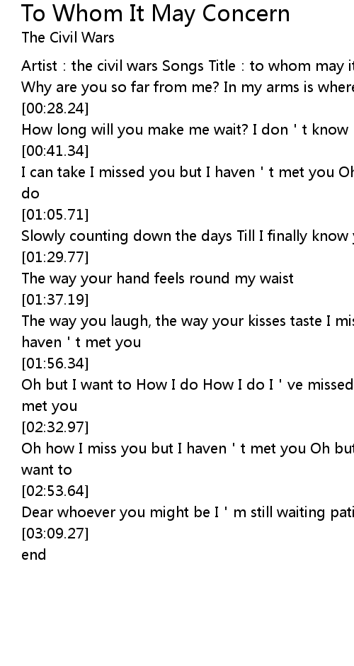 | [00:00.35] | Artist: the civil wars Songs Title: to whom may it concern |