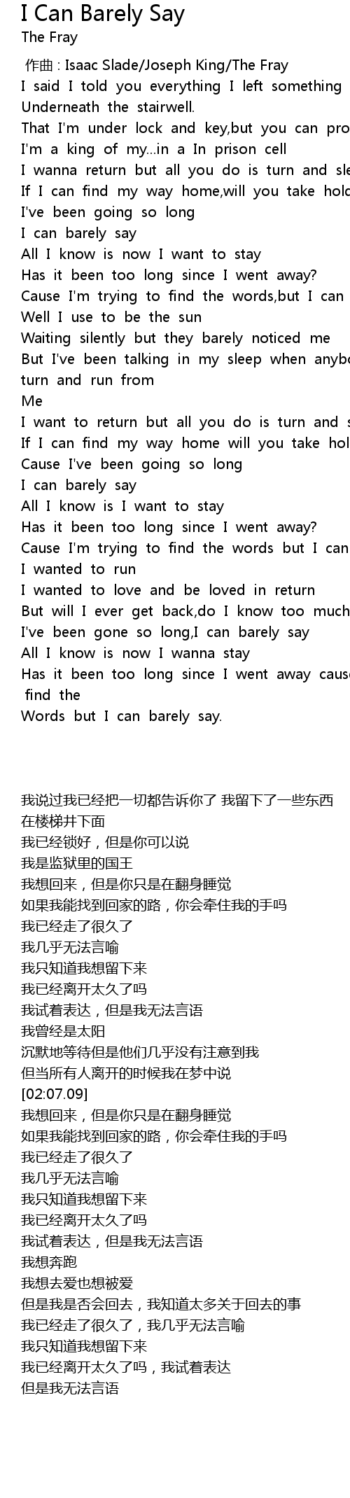 | [02:48.80] | Cause I'm trying to find the words but I can barley say |