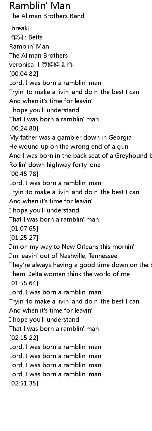 | [02:39.35] | Lord, I was born a ramblin' man |
