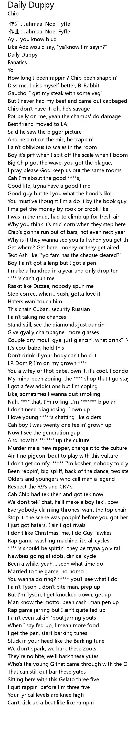 | [00:15.53] | How long I been rappin'? Chip been snappin' |