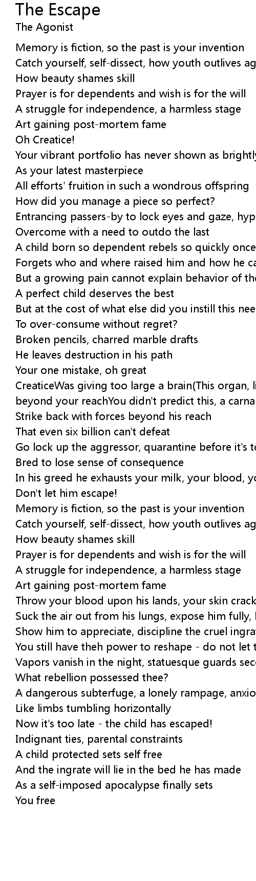 CreaticeWas giving too large a brain(This organ, like disease, can disseminate beyond your reachYou didn't predict this, a carnal rebellion in its wake) |