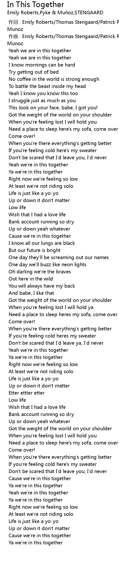 | [00:47.060] | Yeah we' re in this together |