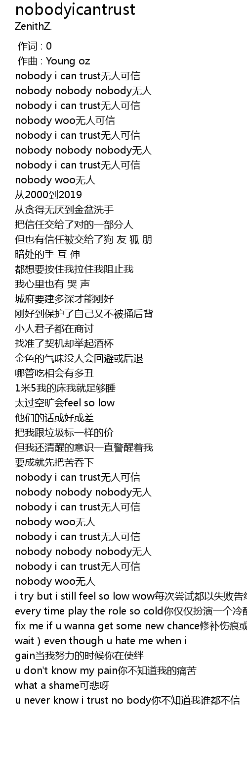 | [00:18.968] | nobody i can trust wú rén kě xìn |