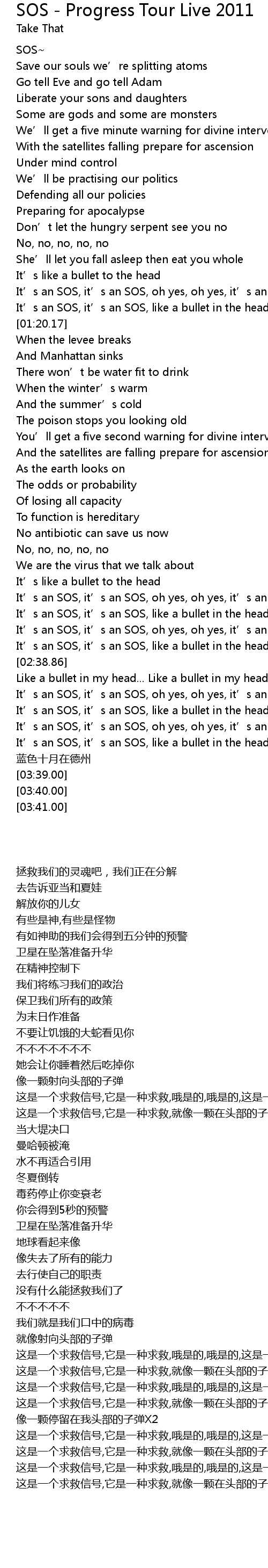 | [03:18.90] | It’s an SOS, it’s an SOS, like a bullet in the head, it’s an SOS |