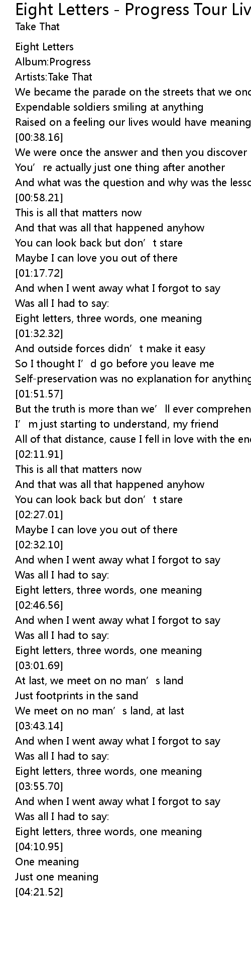 | [03:51.66] | Eight letters, three words, one meaning |