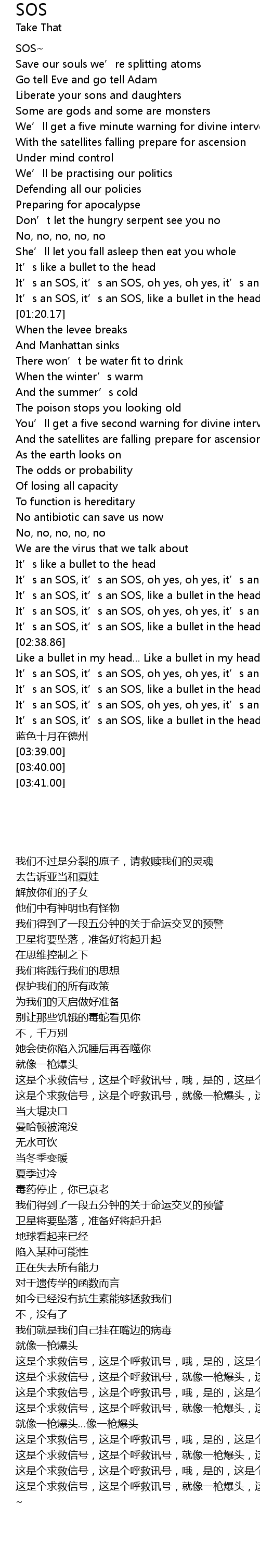 | [03:18.90] | It’s an SOS, it’s an SOS, like a bullet in the head, it’s an SOS |