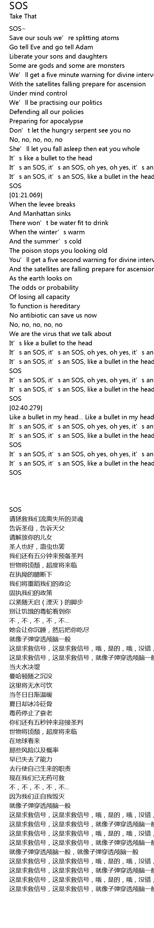 | [03:20.680] | It' s an SOS, it' s an SOS, like a bullet in the head, it' s an SOS |