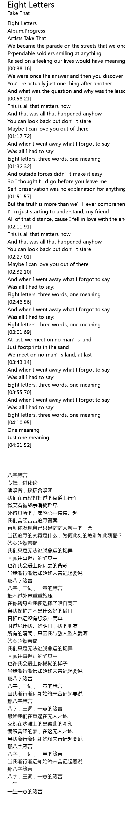 | [03:51.66] | Eight letters, three words, one meaning |