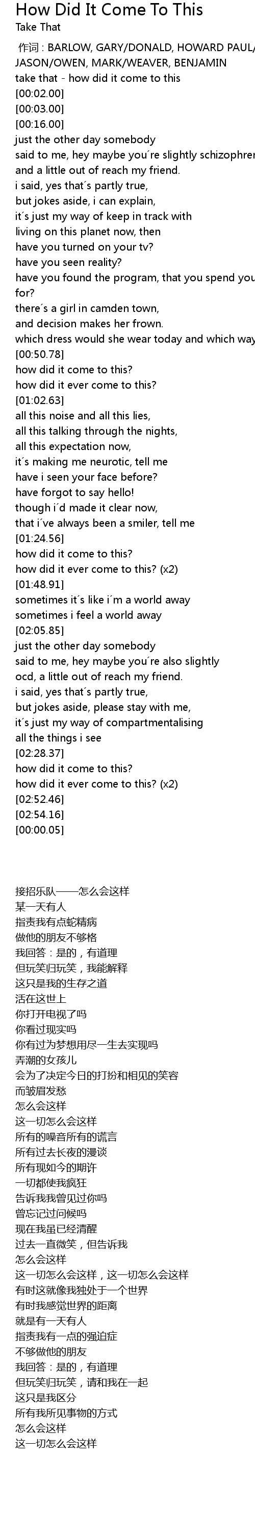 | [00:19.30] | said to me, hey maybe you re slightly schizophrenic |