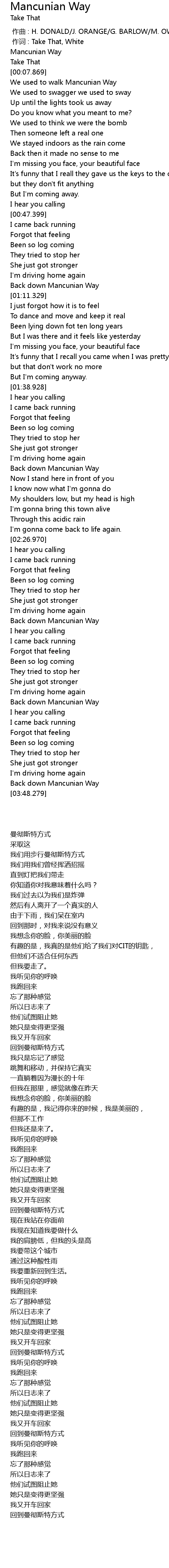 | [00:01.00] | 作词 : Take That, White |