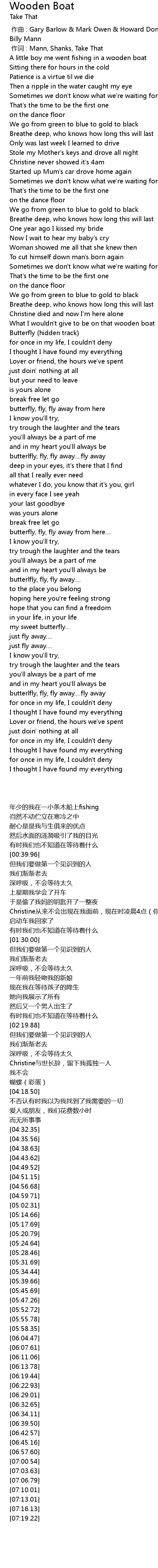 | [00:01.00] | 作词 : Mann, Shanks, Take That |