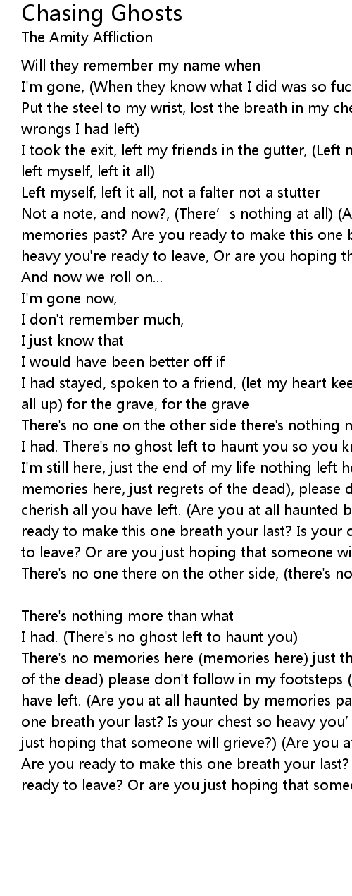 | There' s no memories here memories here just the regrets of the dead regrets of the dead please don' t follow in my footsteps my footsteps cherish all you have left. Are you at all haunted by memories past? Are you ready to make this one breath your last? Is your chest so heavy you' re ready to leave? Or are you just hoping that someone will grieve? Are you at all haunted by memories past? Are you ready to make this one breath your last? Is your chest so heavy you' re ready to leave? Or are you just hoping that someone will grieve? |