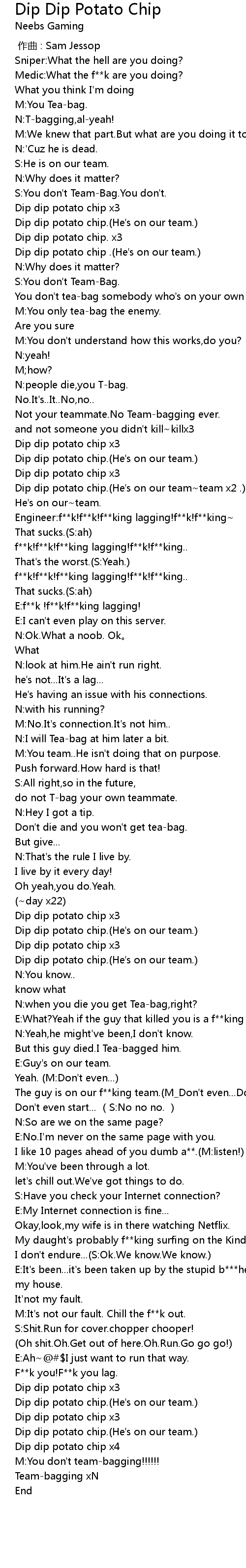| [00:31.256] | Dip dip potato chip .(He's on our team.) |