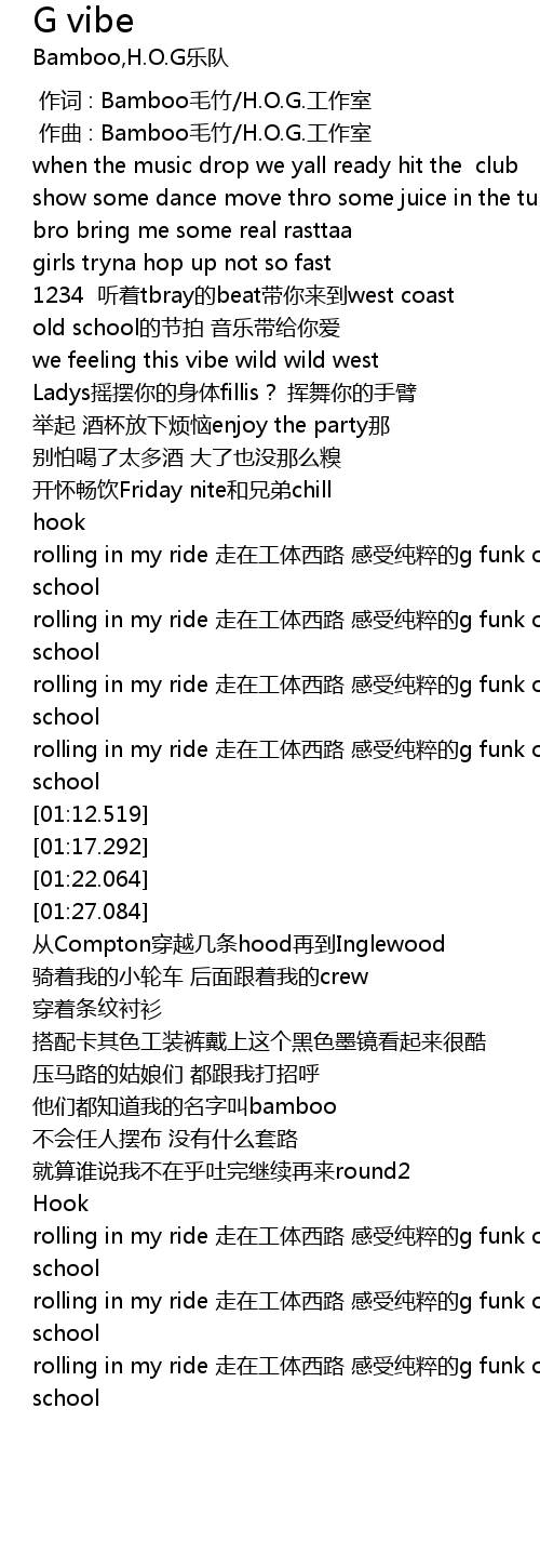| [01:00.467] | rolling in my ride 走在工体西路 感受纯粹的g funk old school |