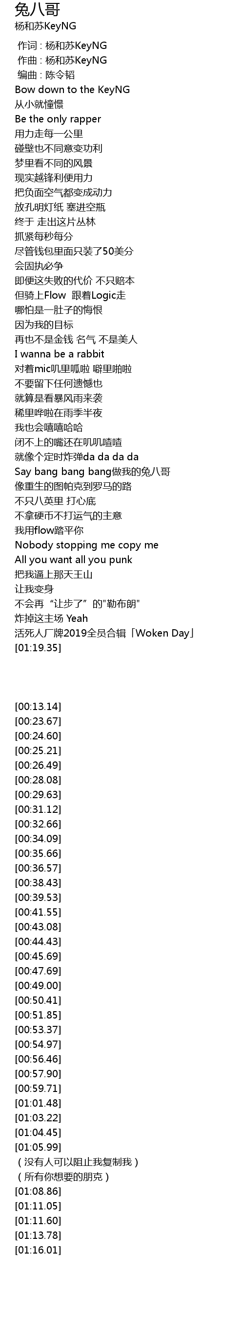 | [00:59.71] | Say bang bang bang做我的兔八哥 |