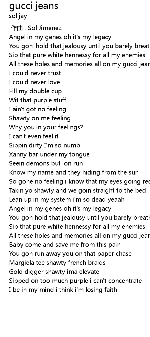 | [00:41.14] | All these holes and memories all on my gucci jeans |