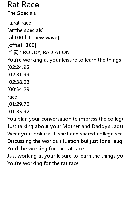 | [00:47.80][00:54.29][01:32.70][02:04.64][02:10.79][02:44.80] | Working for the rat race |