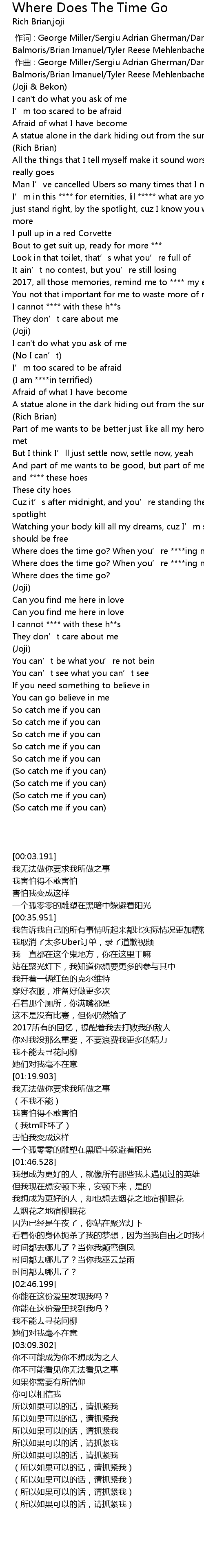 | [02:37.286] | Where does the time go? When you' re ing me |