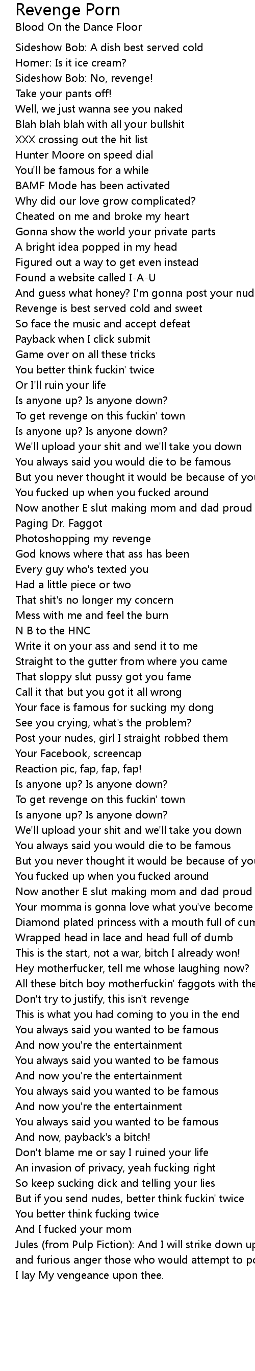 All these bitch boy motherfuckin' faggots with their asses out |