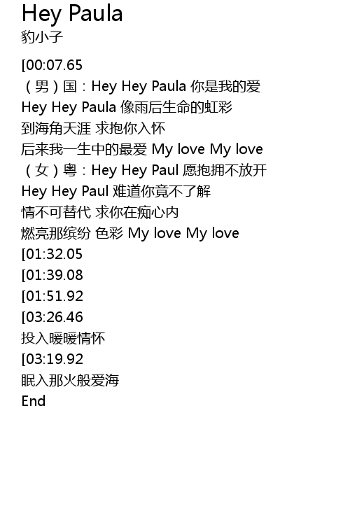 | [00:27.10] | nán guó: Hey Hey Paula nǐ shì wǒ de ài |