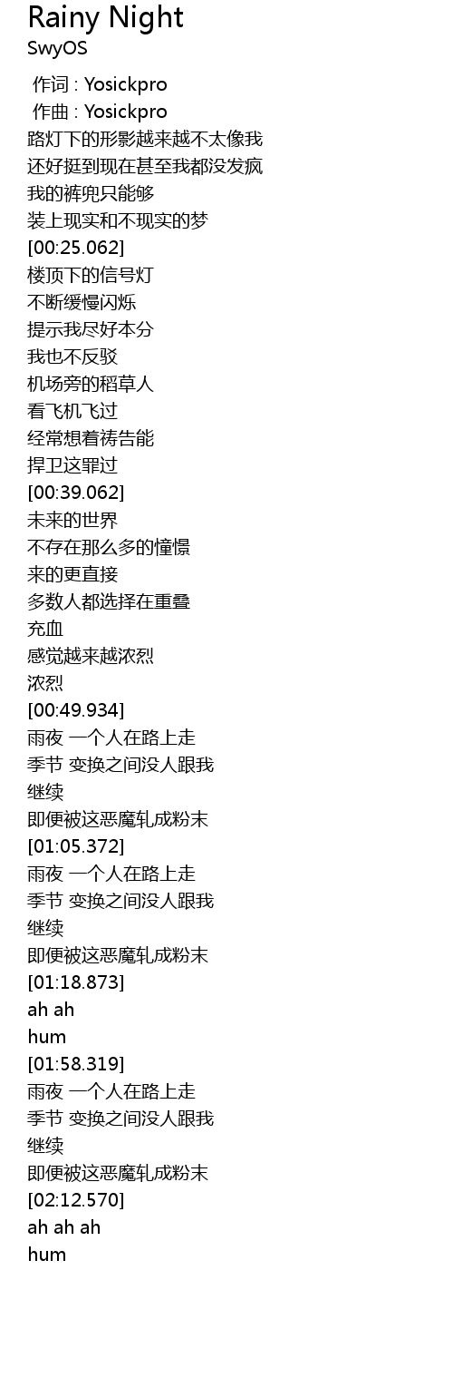 | [00:52.934] | 雨夜 一个人在路上走 |