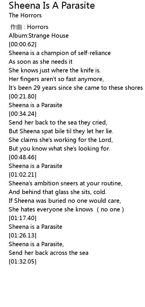 | [00:40.98] | But Sheena spat bile til they let her lie. |