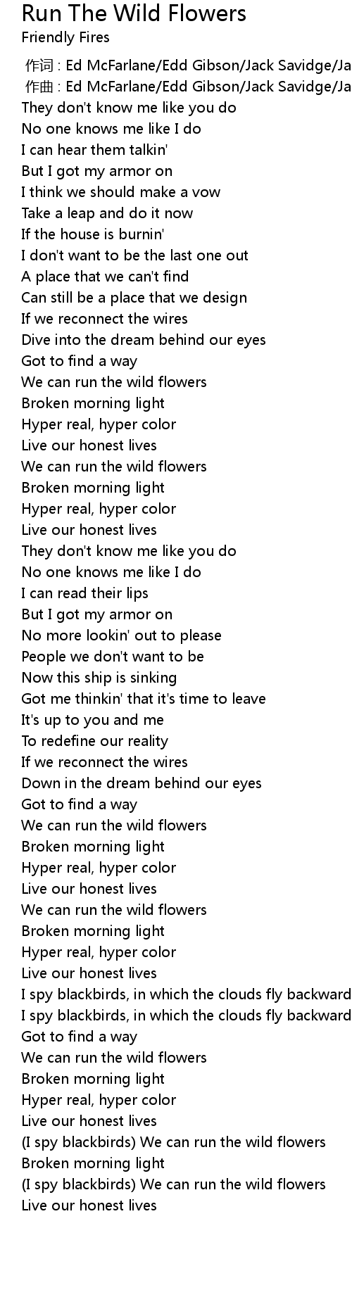 | [04:02.435] | (I spy blackbirds) We can run the wild flowers |