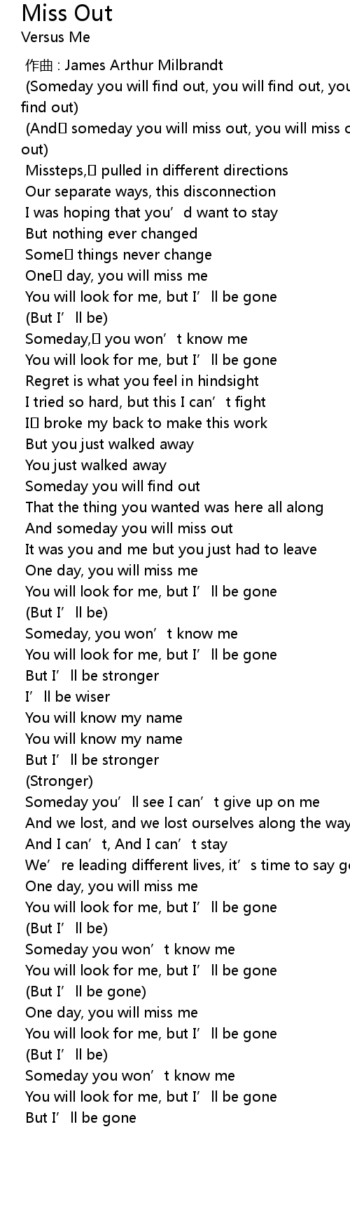 | [00:08.546] | (And someday you will miss out, you will miss out, miss out, miss out) |
