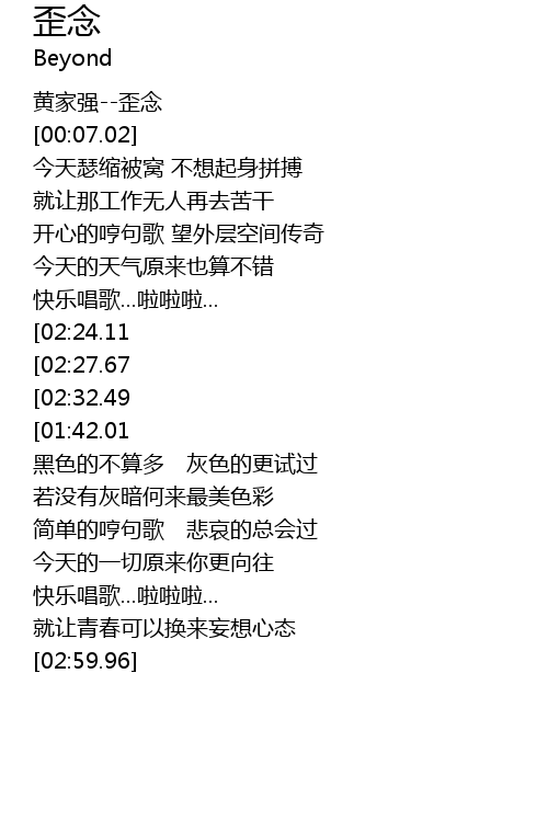 | [02:53.52][01:42.01][00:53.14] | 就让青春可以换来妄想心态(变歪) |