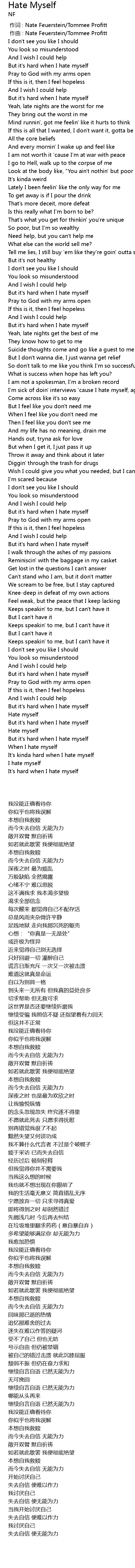 | [00:13.39] | But it' s hard when I hate myself |