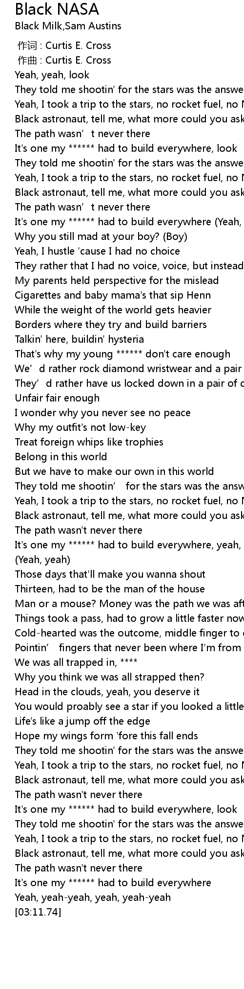 | [00:44.18] | Black astronaut, tell me, what more could you ask for? |