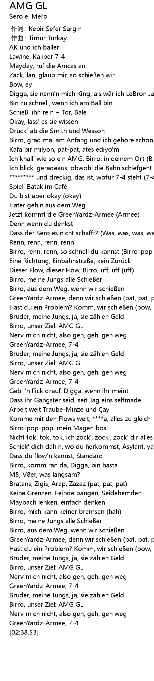 | [00:42.15] | Ich knall' wie so ein AMG, Birro, in deinem Ort (Birro) |