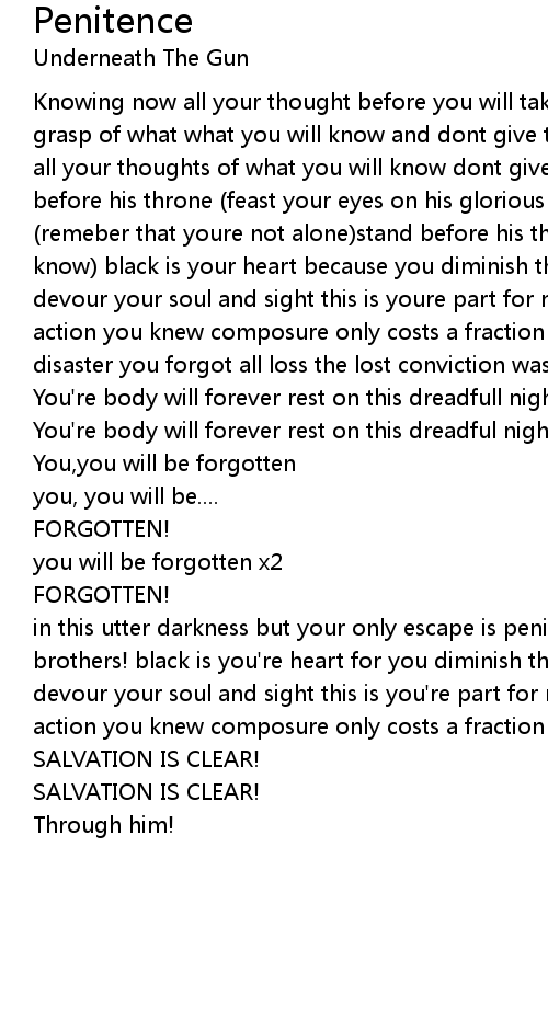in this utter darkness but your only escape is penitence within join with me brothers! black is you're heart for you diminish this decree of light and you devour your soul and sight this is you're part for new finished thought into action you knew composure only costs a fraction |
