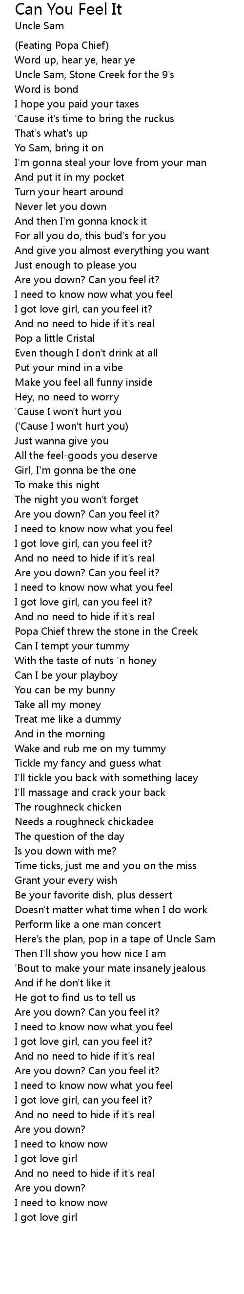 | [02:06.998] | I got love girl, can you feel it? |