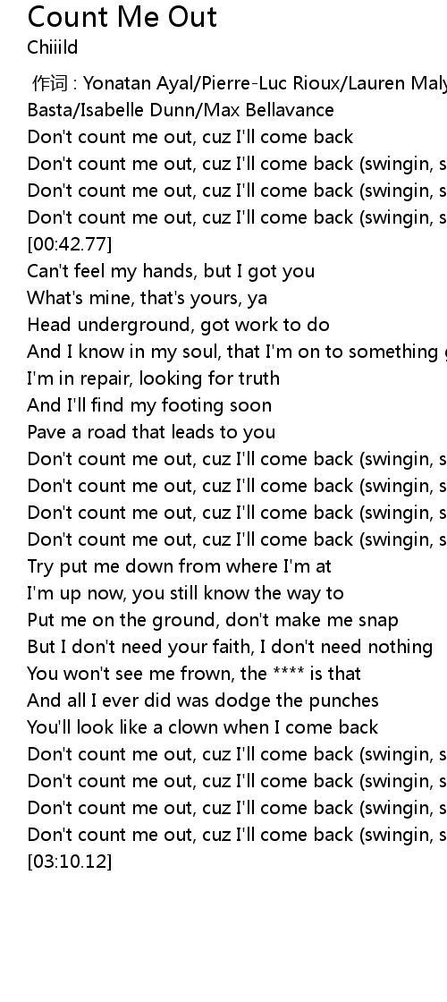 | [02:59.43] | Don't count me out, cuz I'll come back (swingin, swingin) |