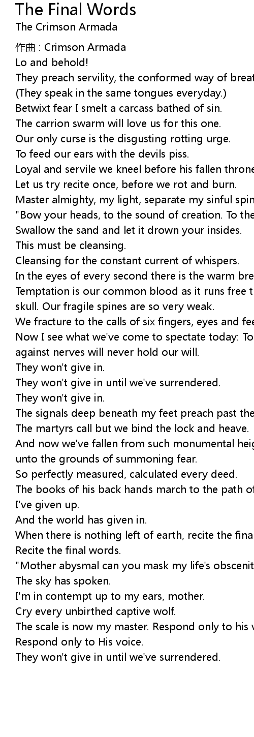 | Now I see what we've come to spectate today: To pit the flesh on our back against nerves will never hold our will. | |