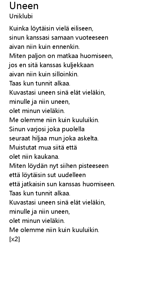 | minulle ja niin uneen, | |