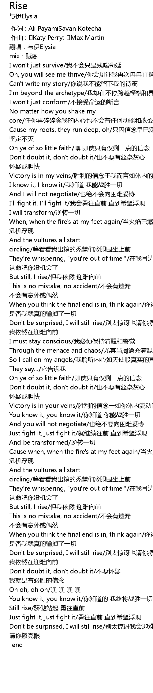 | [01:32.60] | Don't be surprised, I will still rise/别太惊讶也请你擦亮眼 我依然在迎难向前 |