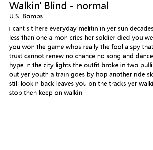 i cant sit here everyday melitin in yer sun decades played in every craze heroes less than one a mon cries her soldier died you were born confused a pawn claims you won the game whos really the fool a spy that lies for the other side cannot trust cannot renew no chance no song and dance he cant hear the tune a junkie hype in the city lights the outfit broke in two pullin in the young and snuffin out yer youth a train goes by hop another ride skip on the caboose yer plans still lookin back leaves you on the tracks yer walkin blind were not walkin they stop then keep on walkin |