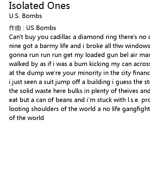 | Can' t buy you cadillac a diamond ring there' s no dough in the ghetto a nine to nine got a barmy life and i broke all thw windows we are the isolated ones we' re gonna run run run get my loaded gun bel air mannequin' s too good for me it walked by as if i was a bum kicking my can across the dirty street to my mansion at the dump we' re your minority in the city financial district we ain' t blessed i just seen a suit jump off a building i guess the stocks in the market crashed the solid waste here bulks in plenty of theives and plenty of greed nothing to eat but a can of beans and i' m stuck with l. s. e. projects road rage car jacks looting shoulders of the world a no life gangfight parasite shooting shoulders of the world |