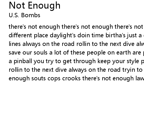there's not enough there's not enough there's not enough crash every night in a different place daylight's doin time birtha's just a ghetto slag cross the state lines always on the road rollin to the next dive always on the road tryin to save our souls a lot of these people on earth are props never gonna wake up like a pinball you try to get through keep your style points always on the road rollin to the next dive always on the road tryin to save our souls there's not enough souts cops crooks there's not enough lawyers doctors goons |
