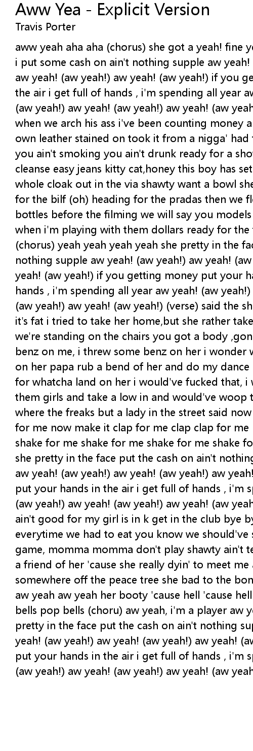 aww yeah aha aha (chorus) she got a yeah! fine yeah! and she pretty in the face i put some cash on ain't nothing supple aw yeah! (aw yeah!) aw yeah! (aw yeah!) aw yeah! (aw yeah!) aw yeah! (aw yeah!) if you getting money put your hands in the air i get full of hands , i'm spending all year aw yeah! (aw yeah!) aw yeah! (aw yeah!) aw yeah! (aw yeah!) aw yeah! (aw yeah!) (verse) aw! i'll white thing when we arch his ass i've been counting money all day all night (bad) with my own leather stained on took it from a nigga' had too get his benz off aw man, if you ain't smoking you ain't drunk ready for a show found what i want easter cleanse easy jeans kitty cat,honey this boy has set up a whole team had the whole cloak out in the via shawty want a bowl she know that when we back heading for the bilf (oh) heading for the pradas then we flesh leave and we spanning bottles before the filming we will say you models we put 'em trought college when i'm playing with them dollars ready for the first street and i feel (chorus) yeah yeah yeah yeah she pretty in the face put the cash on ain't nothing supple aw yeah! (aw yeah!) aw yeah! (aw yeah!) aw yeah! (aw yeah!) aw yeah! (aw yeah!) if you getting money put your hands in the air i get full of hands , i'm spending all year aw yeah! (aw yeah!) aw yeah! (aw yeah!) aw yeah! (aw yeah!) aw yeah! (aw yeah!) (verse) said the shawty got her ass on her and it's fat i tried to take her home,but she rather take cass (aye) dancing while we're standing on the chairs you got a body ,gonna put it in your ass i got some benz on me, i threw some benz on her i wonder what she'll do if i put my hands on her papa rub a bend of her and do my dance on her i only thought the money for whatcha land on her i would've fucked that, i would've oh-oh and want to rip them girls and take a low in and would've woop that, and where my g's at and where the freaks but a lady in the street said now make it clap for me clap clap for me now make it clap for me clap clap for me now make it shake for me shake shake for me shake for me shake for me shake for me (chorus) yeah yeah yeah yeah she pretty in the face put the cash on ain't nothing supple aw yeah! (aw yeah!) aw yeah! (aw yeah!) aw yeah! (aw yeah!) aw yeah! (aw yeah!) if you getting money put your hands in the air i get full of hands , i'm spending all year aw yeah! (aw yeah!) aw yeah! (aw yeah!) aw yeah! (aw yeah!) aw yeah! (aw yeah!) (verse) i ain't good for my girl is in k get in the club bye bye momma,i'm straight everytime we had to eat you know we should've stayed and she ain't with the game, momma momma don't play shawty ain't tear girl, prayin',callin' sissy i met a friend of her 'cause she really dyin' to meet me and i live in the area, somewhere off the peace tree she bad to the bone taking care of her rear aw yeah aw yeah aw yeah her booty 'cause hell 'cause hell 'cause hell pop bells pop bells pop bells (choru) aw yeah, i'm a player aw yeah yeah yeah yeah yeah she pretty in the face put the cash on ain't nothing supple aw yeah! (aw yeah!) aw yeah! (aw yeah!) aw yeah! (aw yeah!) aw yeah! (aw yeah!) if you getting money put your hands in the air i get full of hands , i'm spending all year aw yeah! (aw yeah!) aw yeah! (aw yeah!) aw yeah! (aw yeah!) aw yeah! (aw yeah!) |