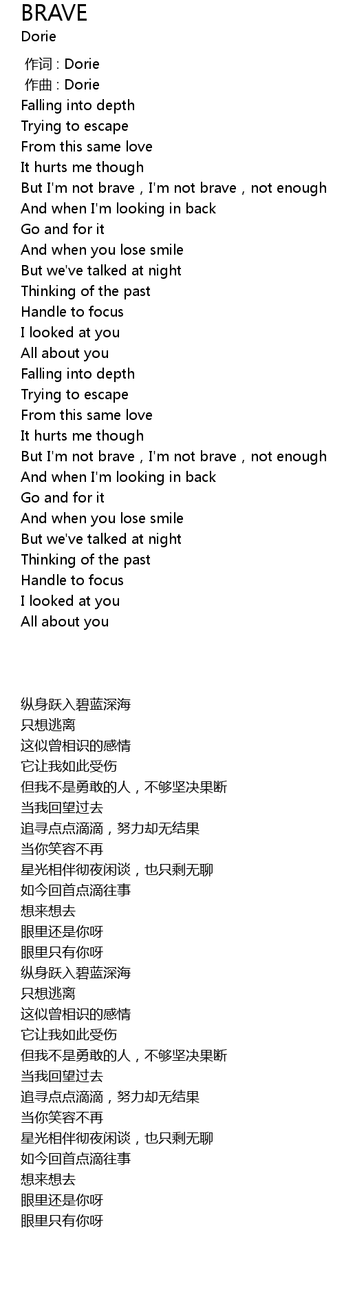 | [00:08.923] | But I' m not brave, I' m not brave, not enough |