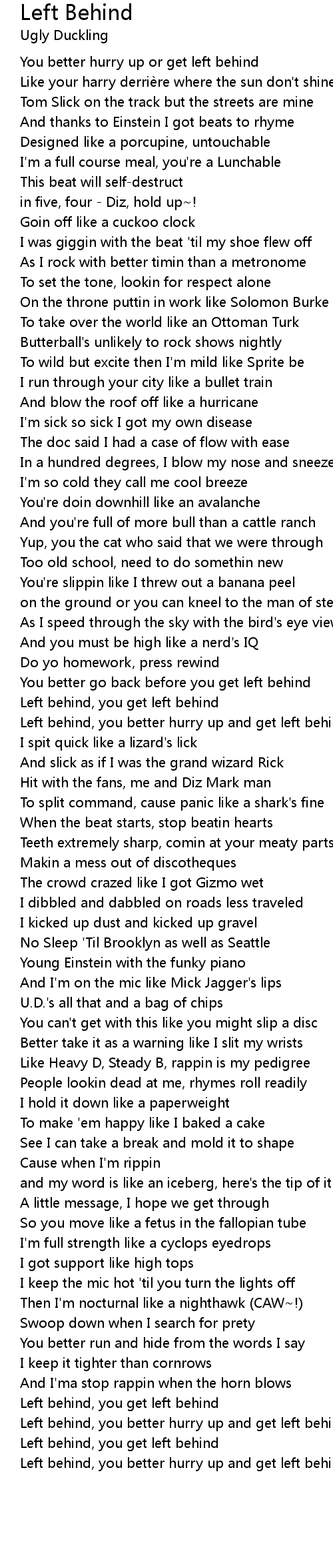 | Left behind, you better hurry up and get left behind | |